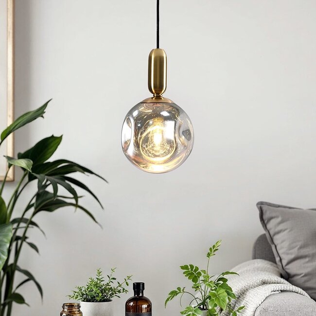 The Lewis pendant lamp is a real eye-catcher in any interior. The artistic design of the glass sphere is not only unique to look at, but also influences the distribution of light. The wavy glass ensures that the light is distributed throughout the room in a playful way. You can choose between chrome-coloured, gold or rose gold glass. Each variant creates an atmospheric look. Choose the colour that best suits your interior and create a harmonious whole. Thanks to its narrow dimensions, Lewis is suitable for use in the bedroom above the bedside tables or in the living room above a side table or coffee table.