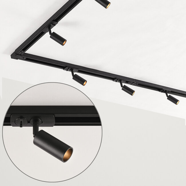 If the power connection is in the middle, you can order the double-sided connection block separately. Please note that the rail is 3.4 cm wide. If the central box in the ceiling is wider than the rail, choose a square cover plate for a neat finish. The great thing about track lighting is that it is a modular system. You can click the spotlights into place anywhere on the rail. Would you prefer to put together your own set? Then take a look at all our rails , spotlights and accessories for track lighting. Need help connecting the system? Take a look at the manual .