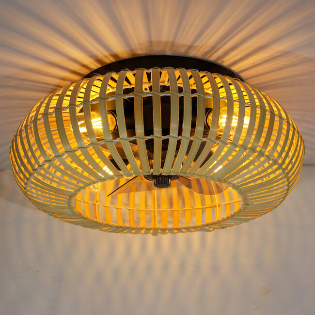 Paco has a diameter of 50 cm and a height of 20 cm. The fan has three speed settings. You can easily operate Paco with the included Remote control. The base of the lamp is black and the frame is made of bamboo.