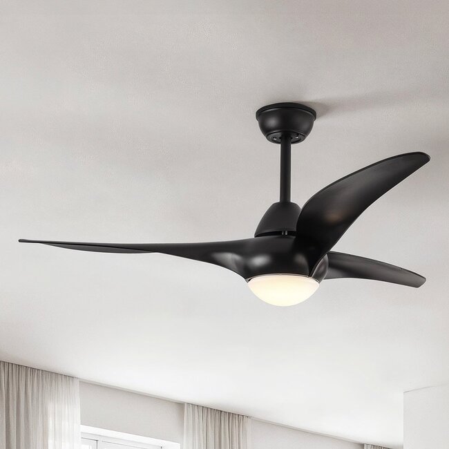 The ceiling fan is available in three colours: black, dark wood and natural wood. This allows you to decide which colour best suits your style.