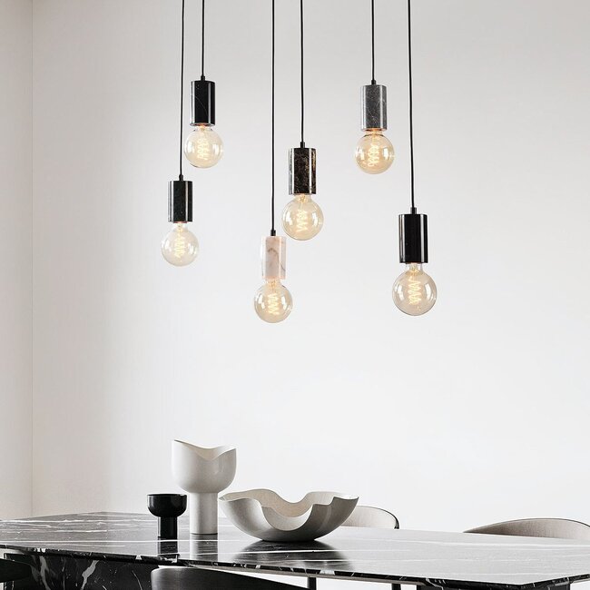 Are you looking for a unique piece for above your dining table, kitchen island or coffee table? Then take a look at this Caverna pendant lamp. Sleek black metal meets authentic marble in powerful shades of black, grey and red – a combination that immediately makes an impression. The six robust lamp holders give this lamp a sturdy and modern look with a luxurious touch. Caverna is guaranteed to attract attention. For lovers of design and a touch of industrial character.