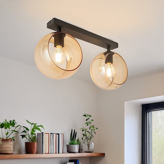 Orbitique. It sounds just like it looks. Two round glass shades that enclose two light bulbs. The Amber glass provides a soft diffusion of light, while the openness of the shade allows you to choose E27 light bulbs (not included) with, for example, coloured glass or a unique filament , such as a spiral-shaped bulb. This allows you to decorate and style the lamp as you wish in multiple rooms, such as the hallway, bedroom or living room.