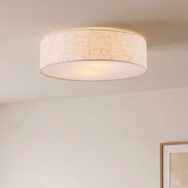The wide linen shade gives the Avani ceiling light a calm and warm look. The light is evenly diffused by the white diffuser, creating soft and pleasant lighting. Thanks to its flat design, this lamp is suitable for rooms with lower ceiling heights, such as the hallway, bedroom or living room. The neutral off-white colour can be easily combined with various interior styles. Equipped with two E27 lampholders (light bulbs not included), allowing you to create your desired lighting atmosphere.