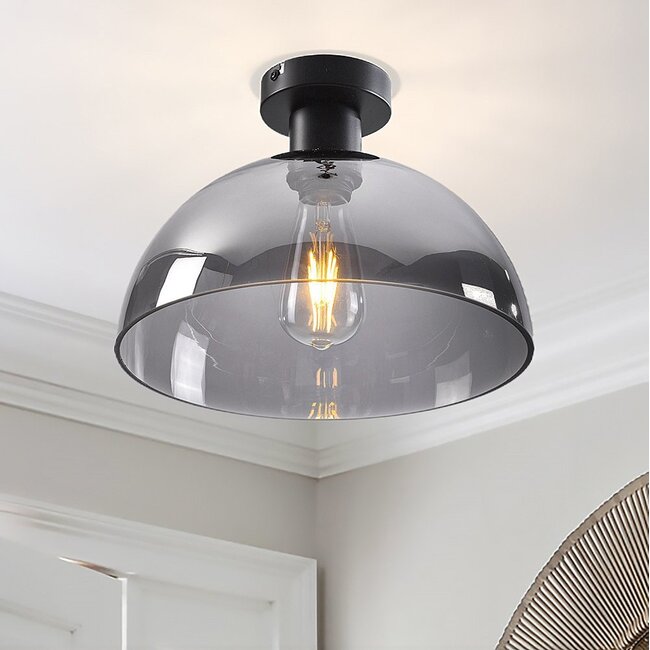 Feija is made of high-quality metal and the glass shade of smoked glass. The ceiling light has a diameter of 30 cm and a height of 22 cm. The ceiling plate measures Ø10 x 2.5 cm. With an IP20 rating, the lamp is only suitable for indoor use.