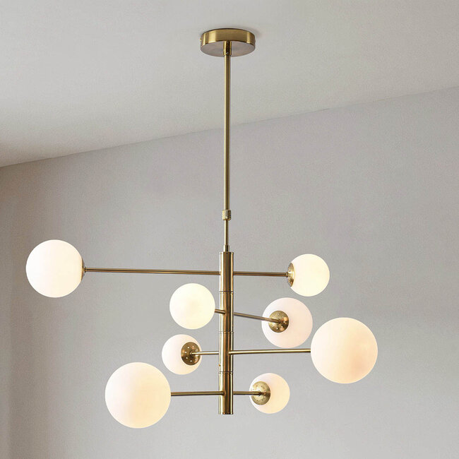 The gold fixture is made of high-quality iron. The ceiling plate has a diameter of 12 cm and a height of 2.5 cm. The total height of the lamp is adjustable, you can choose between 75 to 110 cm and the width of Oito is 86 cm. The opal white glass spheres have two different dimensions: Ø9 cm and Ø12 cm.