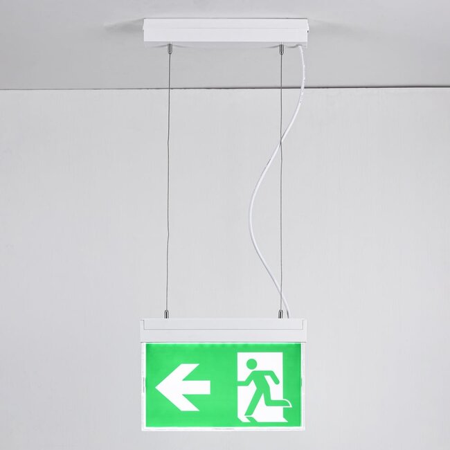 Emergency lighting with pendant provides essential lighting in emergencies and can be mounted on high ceilings, depending on the specific needs of the space. The lighting has a colour temperature of 6000K, which provides bright, cool white light and optimal visibility during an emergency, enabling safe evacuation. The fixture has 16 SMD LEDs. This fixture comes with four pictograms (PVC) that have the following arrow directions: left, right, up and down. The pictograms can be placed on both sides of the fixture. This emergency lighting with 50 cm steel wire is ideal for mounting on high ceilings.