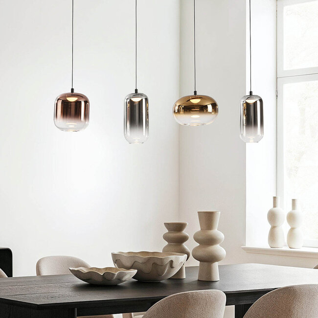Bring luxury and atmosphere into your home with the Kohi pendant – a 4-light design featuring glass shades in unique colours. The combination of glossy smoked glass, gold and copper gives the lamp a luxurious look that suits a modern or chic interior. The variation in shape and colour creates a playful yet stylish effect above the dining table, in the living room or above a kitchen island. Equipped with integrated LEDs and a 3-step dimming function, you can always create the perfect atmosphere.