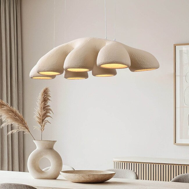 Looking for a pendant lamp in the unique Wabi-Sabi style? Then the Tsuyu is a real eye-catcher above the dining table. Made of high-quality polyform with a refined stone structure, this lamp exudes natural tranquillity with a bold accent. For this lamp, you need 7 x E27 light bulbs of max. 7W LED. For the best results in a cosy space, put a warm LED light bulb in the pendant lamp to create a warm lighting effect.