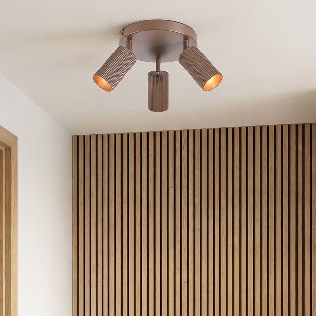 The Blaze ceiling light with three spotlights has a compact, round design and is finished in brown metal with ribbed spotlights. The three individually adjustable spotlights allow the light to be directed, for example, over a worktop, wall or seating area. The warm brown colour combined with the metal finish gives the lamp a calm, modern look that fits well in a variety of interiors. Blaze is equipped with three GU10 lampholders (light bulbs not included), so you can choose the light bulb and light colour that suits the space. Thanks to its round ceiling plate, this ceiling spotlight is suitable for various rooms, such as the hall, kitchen or living room.