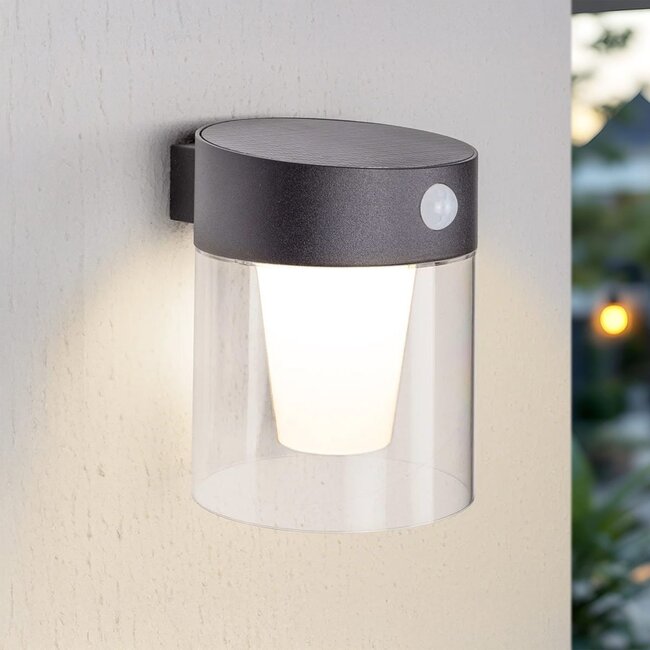The Pim outdoor wall lamp is a functional lamp that runs on solar-powered energy. No more fumbling around for the handle of an outside door, because Pim has a motion sensor and will welcome you with warm light. Pim has a black matt shade with a transparent underside through which you can see the integrated LED light source shining. Solar-powered energy is captured by the solar panel on the top of the shade. You can also adjust the light output yourself. You can choose between 70 or 13 lumens. With an IP44 rating, the lamp is splash-proof, making it a good choice for mounting on an exterior wall. Install the lamp in several places around your home to create a unified look.
