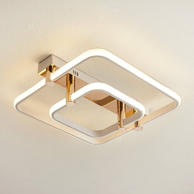 Are you looking for a square ceiling lamp that creates three-dimensional light? Then Malva is the lamp you are looking for. The Malva ceiling lamp is a real eye-catcher. The two square light bulbs create a three-dimensional lighting effect. The gold fixture and white light bulbs give the lamp a luxurious look. Hang Malva above a table or workspace and enjoy the high light output. The ceiling lamp has different colour temperatures that can be controlled with the included remote control. This allows you to choose between 3000K (warm white), 4000K (neutral white) or 6000K (bright white). You can also dim the ceiling lamp, allowing you to adjust the lamp to your preferences.