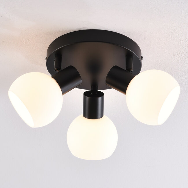 Is your bedroom, kitchen or hallway missing an attractive ceiling lamp? Then choose Peri. The three spotlights are rotatable, allowing you to determine the direction of the light yourself. This makes the lamp both functional and attractive. With Peri, you can choose between milky white glass or amber glass in combination with a high-quality black frame.